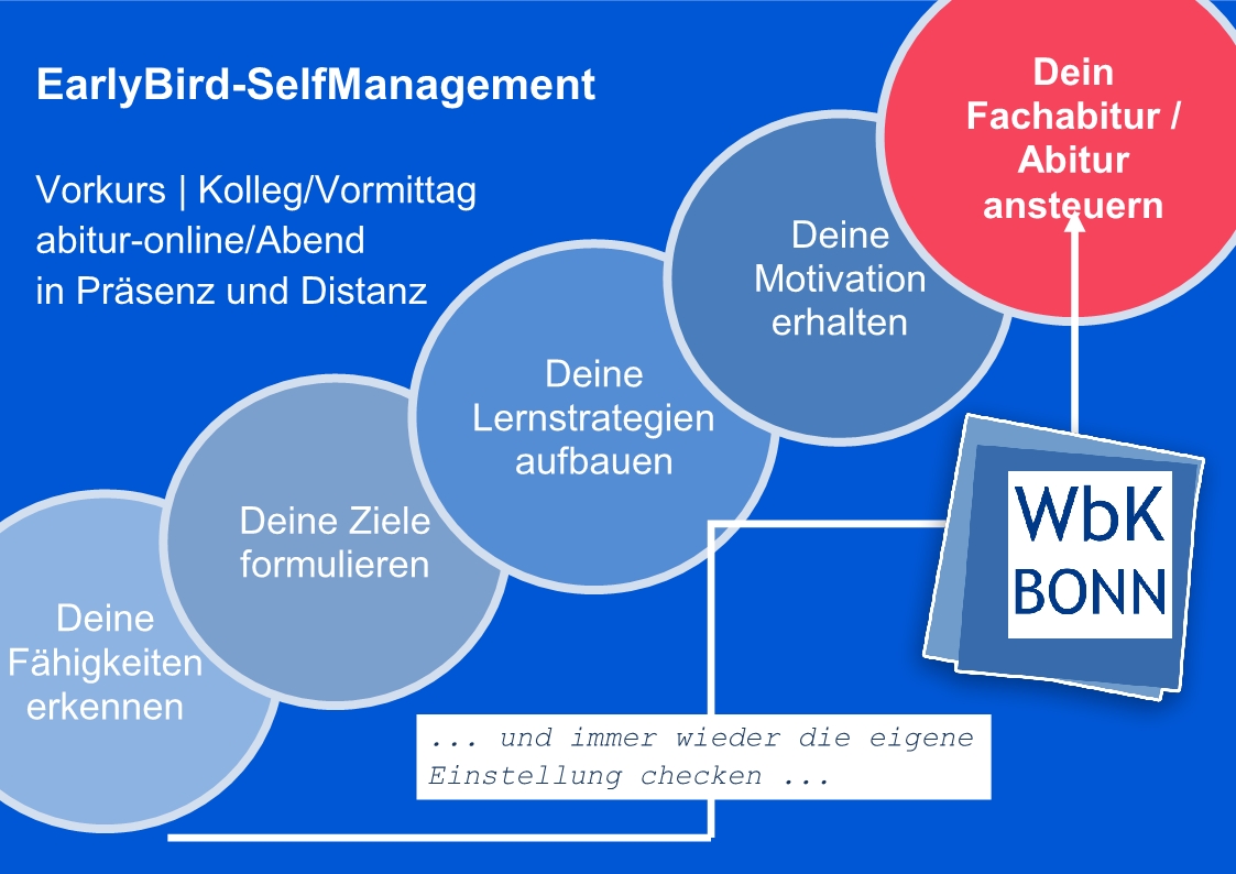 Im Vorkurs belegen Sie, eingebunden in das Fach Pädagogik, den Kurs EarlyBird-SelfManagement. Der Kurs will Ihnen einen guten Start in das erste Semester der Einführungsphase ermöglichen. Sie erarbeiten gemeinsam, wie Ziele sinnvoll formuliert werden können. Sie beschäftigen sich mit Fragen des Selbst- und Zeitmanagements. Es werden Strategien erarbeitet, wie Sie Ihre Motivation auf dem Weg zu Ihrem höheren Schulabschluss auf dem nötigen Level halten können. Ausgehend von Fallbeispielen üben Sie, wie Sie Ihre persönlichen Lernzeiten, z. B. für die Vorbereitung von Tests oder Klausuren, zwischen Schule, Arbeit und Privatleben sinnvoll organisieren können. Der Kurs knüpft an Ihre Fähigkeiten an und entwickelt diese weiter. Ihre Interessen und Bedarfe werden in die Unterrichtsvorhaben eingebunden.